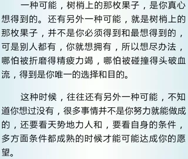 仰望那些够不着的东西,实际上是一种煎熬,倘若你想要的东西,就是那个高高地挂在树梢上的果子,即便你踮起了脚尖,即便你搬来了梯子,即便你找来了长长的竹竿,仍然够不着那枚挂在树梢上的果子,你会做何打算?选择放弃还是选择继续?