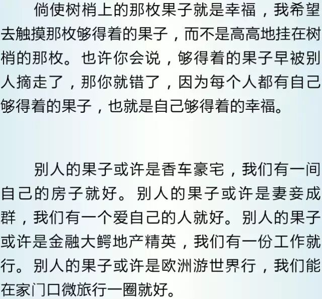 其实不然,与其触摸那些够不着的幸福,被折磨得死去活来精神分裂,还不如守住和珍惜手里已有的幸福,触摸那些看得见够得着实实在在的幸福,抬头能看见蓝天,低头能闻到花香,亲人安好,朋友快乐,身体健康,不都是够得着的幸福吗?
