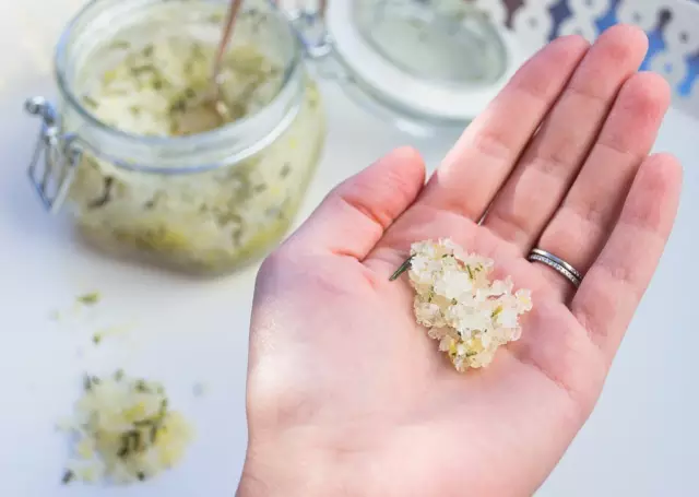 挤出的柠檬汁倒入食用盐里,搅拌好,形成半糊状。