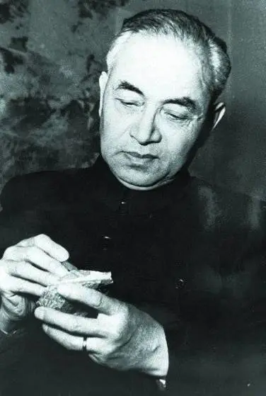 △1965年,李四光在北京地质部研究所察看矿石标本