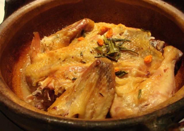 材料:黑枣酒1/3瓶、童子鸡1只、干龙眼10个、八角1粒、老姜4片、红辣椒1只、冰糖20克、春葱2棵、蒜头粒6粒、栗子10粒、生抽2汤匙、盐1/2茶匙、胡椒粉1/2茶匙、清鸡汤150克、老抽适量。 做法: 1、煮一锅沸水,然后放入洗净的童子鸡煮出血水后捞出洗净再沥干水分。