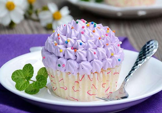 1.蛋黄蛋白分离,在蛋黄里加入20克细纱糖办匀。(蛋白要装入干净无油无水的容器里) 2.加入牛奶和玉米油搅拌均匀。 3.筛入过筛了一次的低粉。 4.轻轻翻拌均匀 5.蛋白装入干净无油无水的容器里,用电动打蛋器低速打至鱼眼泡的样子。 6.分三次加入白糖,打发至硬性发泡的状态。 7.取1/3打发好的蛋白,加入到蛋黄糊里。 8.轻轻翻拌均匀。(要用切半与翻拌的手法,不要画圈,否则容易消泡) 9.把翻拌好的蛋黄糊倒入剩余的2/3的蛋白里。 10.轻轻翻拌成细腻的蛋糕糊。 11.打发好的蛋糕糊装入纸杯里,八分满即可。 12.放入预热好的烤箱,中层,上下火,160度烤约15分钟。 13.烤好的蛋糕立即取出,然后放在烤网上晾凉。 14.取适量打发好的淡奶油,装入配有圆形花嘴的裱花袋里,然后直线挤在蛋糕的表面,成一个半圆形。 15.接着取适量紫色的淡奶油,装入配有菊花嘴的裱花袋里,依着白色淡奶油,从底部往上挤花,依次挤到顶。(这样裱好花的蛋糕杯看起来是很饱满的) 16.全部裱完以后,在表面撒上稍息糖珠装饰即可。