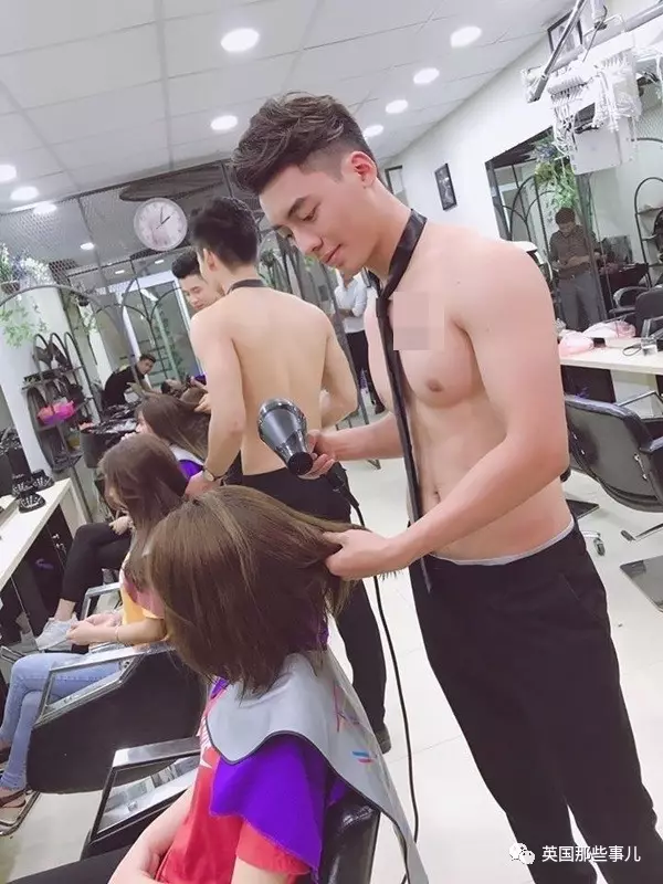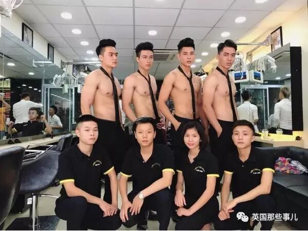 这就是这家沙龙的特色, 他们的男性理发师们在工作的时候不穿上衣... 一进门, 就是一排光膀子的“小鲜肉”等着你选...