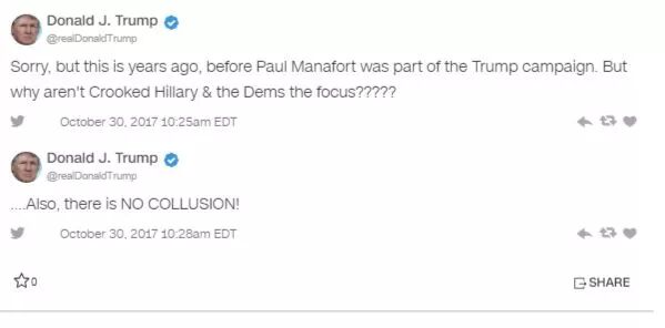 对特朗普有利的是,这12项罪名并没有包含与俄罗斯密谋干预选举的指控,这12项罪名也都是在马纳福特进入特朗普竞选团队前犯下的。特朗普所犯的,最多是“识人不明”罢了。 正因为如此,特朗普30在推特上说,“对不起,这是很多年前的事情了,它发生在马纳福特进入川普阵营前。但为什么不是邪恶的希拉里和民主党人成为焦点被查?”此后他还发第二条推特称:没有密谋!