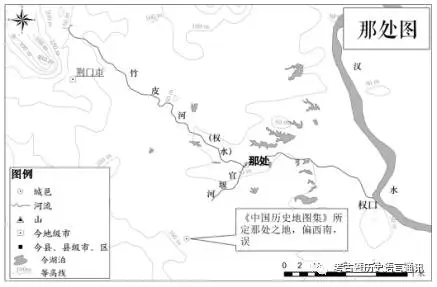 《左传》庄公十八年:“迁权于那处。”杜注:“那处,楚地,南郡编县东南有那口城。”《水经注·沔水》:“沔水又东,右会权口,水出章山,东南流迳权城北,古之权国也。《春秋》鲁庄公十八年,楚武王克权,权叛,围而杀之,迁权于那处是也。东南有那口城。权水又东入于沔。”按权水即今荆门市境的竹皮河,该河为汉江下游右岸支流,长72公里。发源于荆门市东宝区子陵铺、掇刀区、钟祥市及沙洋县境内,在沙洋县马良镇蛾子港汇入汉江。按《水经注》的记载,权水东南流经权城北,又东南流至那口城,即那处之地,最后东流经权口汇入汉水。按古时常以两水汇集之处称“口”,则那口城亦在数水汇集之处。考竹皮河进入今钟祥市境后,先后有发源于荆门市东宝区的革集河和官堰河汇入,其汇入之地,地势由丘陵向平原过渡,恰成一口形,其地肥沃,为由上游山洪及汉江淤积形成的沼泽湿地,湖泊众多,1959年曾兴办农场。楚武王迁权人于此,亦足以开垦荒地,收取农赋。故定那处于此。《中国历史地图集》标注那处偏在西南十公里处,与其地形不合,误。 见下图“那处图”。