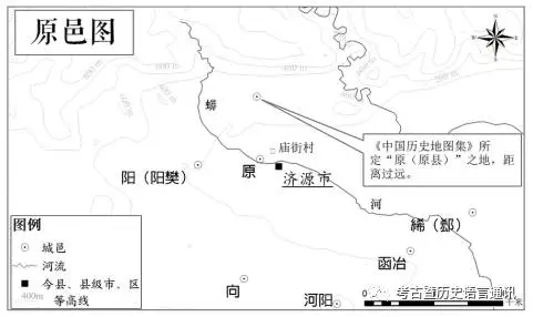 《左传》僖公二十四年记富辰谏曰:“毕、原、酆、郇,文之昭也。”原为文王子原叔始封之国。春秋时属周,为周大夫苏氏所有。《左传》隐公十一年:“王取邬、刘、蔿、邘之田于郑,而与郑人苏忿生之田:温、原、絺、樊、隰郕、欑茅、向、盟、州。君子是以知桓王之失郑也。……己弗能有而以与人,人之不至,不亦宜乎。”可见周桓王取郑之四地是实取,而与郑人苏忿生之田是虚与,盖因此时周王并不能取苏氏之邑与郑国交换也。公元前650年,狄灭温(苏),周王室才实控苏氏之地。公元前635年,在晋文公助周室平定大叔之乱后,周惠王将原赐给晋文公,原地从此属晋,成为晋南阳之地的一部分。其地之所在,按《水经注·济水》:“今济水重源出轵县西北平地,水有二源:东源出原城东北,昔晋文公伐原以信,而原降,即此城也。俗以济水重源所发,因复谓之济源城。其水南迳其城东故县之原乡。”又《元和郡县图志》河南府一济源县:“济水,在县西北三里。平地而出,有二源,其东源周回七百步,深不测。西源周回六百八十五步,深一丈,皆缭之以周墙,源出王屋山。”古济水上游即今济源市境内北蟒河,发源于山西省阳城县东山乡花野岭,其东源在今济源市西北2公里庙街村,轵县即今河南济源市东南轵城镇,其西北即济源市,则原城当在今济源市之西北。清乾隆《济源县志》卷二:“原城在县西北四里,今呼为原村。……今济庙西龙潭东北有遗址焉。”今定其于济源市西北2公里庙街村西南。《中国历史地图集》春秋图组定其在济源市西北偏北8公里左右,过远。 如下图“原邑图”所示。