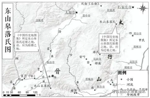 《左传》闵公二年:“晋侯使大子申生伐东山皋落氏。”杜注:“赤狄别种也。皋落,其氏族。”皋落氏之地,服䖍曰:“皋落,赤狄之都也。”《水经注·河水》:“清水历其南,东流迳皋落城北。服虔曰:赤翟之都也。世谓之倚亳城,盖读声近转,因失实也。《春秋左传》所谓晋侯使太子申生伐东山皋落氏者也。”按清水即今山西境内毫清河,其河发源于闻喜县石门乡岔沟,东南流入垣曲县境内,经上官,皋落乡、峪里、长直乡、上毫村,最后汇入黄河小浪底库区。皋落乡即皋落城所在。又今山西昔阳县有皋落山,《寰宇记》乐平县:“乐平山在县东七十六里,即古东山皋落氏之地。”即今昔阳县东南皋落镇。此两镇均为皋落,应有前后相承的关系。或者太子申生所伐为垣曲县之皋落,其后皋落氏族北迁至昔阳县,春秋末期遂为晋所灭欤?因闵公时代晋国初定,正须扫清附近东山中的赤狄部落,以保证都城的稳定,故晋献公派遣太子申生出征讨伐,这正是卧榻之侧岂容他人鼾睡的形势。而对新起的强大晋国,东山皋落氏被讨伐后,为避晋兵锋,北迁至昔阳县之皋落,按此条迁移路线上,有赤狄甲氏,留吁,铎辰,潞氏诸族,为赤狄聚居之传统地域,晋国还需上百年时间,才能彻底征服这些部落。东山皋落氏才能获得休养生息的机会。所以,揆之以当时情势,东山皋落氏的迁徙,自南向北的可能性要大于自北向南的可能性。《中国历史地图集》春秋图组以昔阳县之皋落为东山皋落氏始都之处,而以垣曲县之皋落为迁都之处。以政治形势判之,于情理不合。故不从《中国历史地图集》春秋图组的标注,而以垣曲之皋落为其始都,而以昔阳之皋落为其移治。 见下图“东山皋落氏图”。
