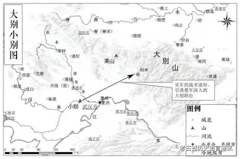 《左传》定公四年:“史皇谓子常:‘楚人恶而好司马,若司马毁吴舟于淮,塞城口而入,是独克吴也。子必速战,不然不免。’乃济汉而陈,自小别至于大别。三战,子常知不可,欲奔。”杜注:“《禹贡》:‘汉水至大别南入江。’然则此二别在江夏界。”按杜注引《禹贡》说不确。或以此为据,认为大别为江夏之鲁山,在今湖北省武汉市汉水汇入江水之处。则自小别(汉川市甑山村)至大别,子常一直在将吴军往东方击退,这正是完成了战略目的的军事行动,何以子常会“知不可,欲奔”呢?且子常有与司马(沈尹戌)争胜之心,见到有利可图,只会更加挥军深入,又怎么会“欲奔”呢?真正能让子常感到恐惧的,是胜利来得太过容易,吴军到达了有利于自己的战场,子常突然发现自己已经孤立无援等等因素,揆之战场形势,从小别到大别,对吴军来说,应该是一个深远的诱敌深入到达自己的预设战场的军事行动。如果大别之地在今武汉市汉水西岸,则吴楚大战就会在今武汉市西部发生,而无由在武汉市东北一百公里处的汉水之东的柏举进行决战,所以大别山必与柏举之战的战地相近。此大别山应指今鄂豫交界处的大别山,在今湖北东北、河南东南、安徽西南三省交界之处。此即《尚书•禹贡》“内方至于大别”中的“大别”。又《汉书•地理志》六安国安丰县:“《禹贡》大别山在西南。”1638-1639均可说明《禹贡》中的大别山有多处。杜注所引《禹贡》,为误引其文。大别山西接桐柏山,东延至霍山、张八岭,西段呈北西-南东走向,东段呈东北-西南走向。一般海拔500-800米,主要部分海拔1500左右。吴军为吸引楚子常军深入,由小别退至大别,退却了大约一百五十公里,最后背倚大别山,在柏举与楚军决战,一战而胜,遂追亡逐北,直至郢都。《中国历史地图集》春秋图组本条无标注。 见下图“大别小别图”。