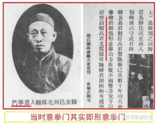 但是在意拳诞生的早期,“形意拳”却常常主动使用“意拳”作为拳名的简称。 比如,著名武术家韩其昌,他是河北深州人。可是在1929年举办的杭州比武大会上,他登场表演的是形意拳,而自我介绍却是“意拳门”。这个韩其昌后来遇到尹谢章传授给他“落地干枝五式梅花桩”,又叫梅拳。