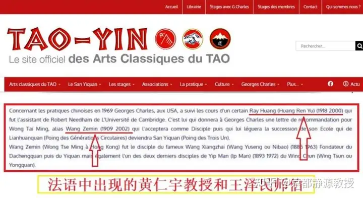 1969年,法国青年学生乔治·查尔斯到美国作交换学生和访问学者。 在加州召开的东亚学术会议上,当时已经修炼日本空手道的乔治·查尔斯,看到一位大会代表在休息时练形意拳和站桩,他感到好奇,就主动向黄仁宇教授求教,想学习中国的形意拳和站桩功法。 因为当时乔治·查尔斯在美国的时间有限,于是,黄仁宇教授推荐他返回法国后,向他在法国的好友王泽民学习形意拳和意拳。结果乔治·查尔斯很兴奋,立刻就恳求黄仁宇教授赶紧给他写推荐信,于是黄仁宇教授当场就撰写了一封推荐信。 乔治·查尔斯回到法国以后,立刻就拜访了王泽民师伯。结果王泽民一看是自己的老朋友黄仁宇教授亲自写的推荐信,当时就答应了收他为徒。这个拜师过程,乔治·查尔斯在他的形意拳网站上有介绍,我们截图如下,他写的是法语。