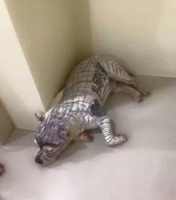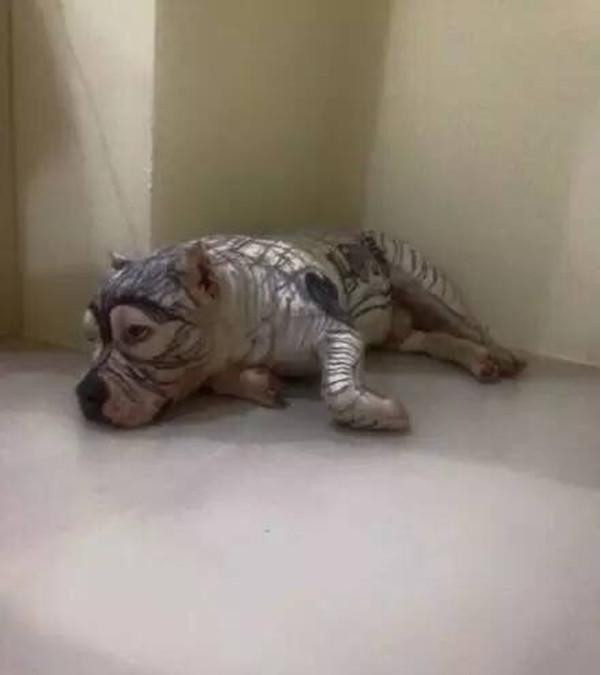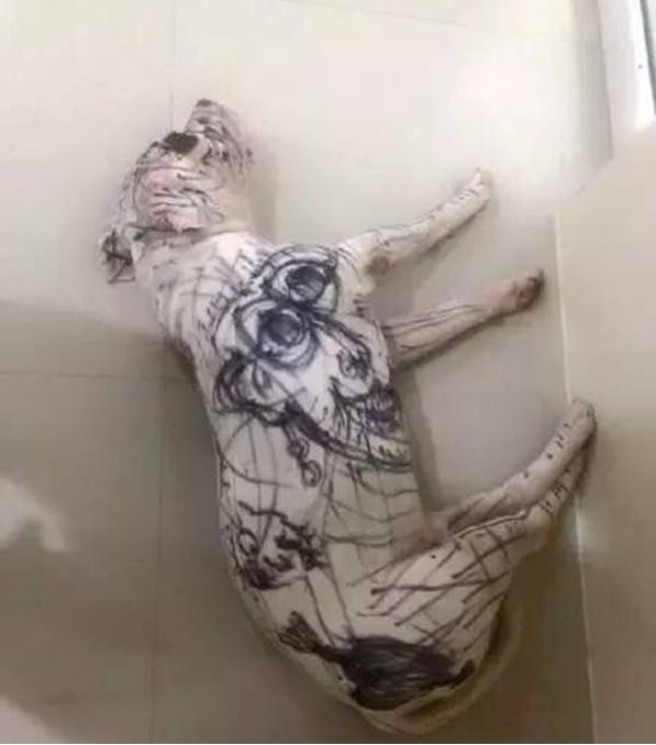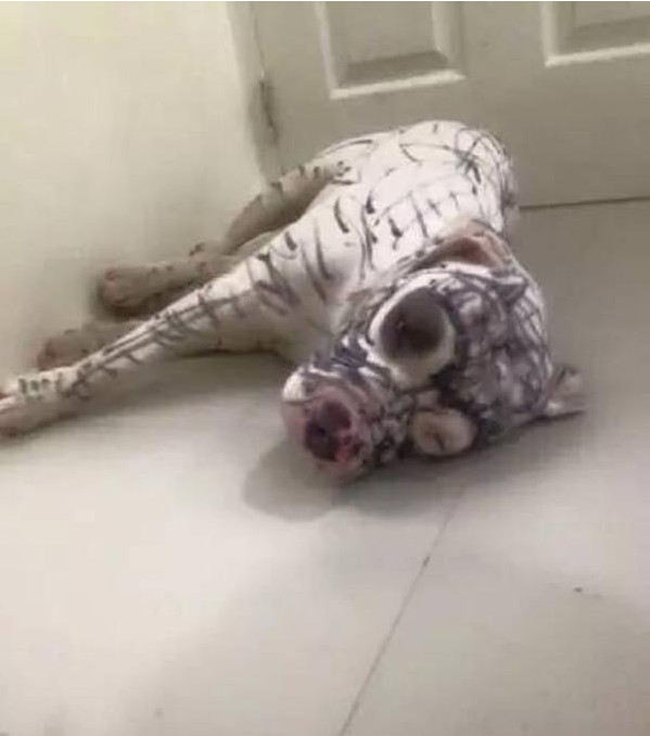 心疼却笑出声的主人马上拉去可怜的狗狗去洗澡,但外国没有汰渍,速干记号笔已经洗不掉了。本来狗狗每天都很活泼,这下成了蔫茄子,每天就趴在地上思考狗生。