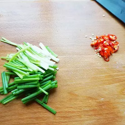 4.辣椒切圈,香葱切寸段。