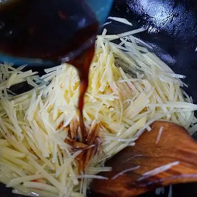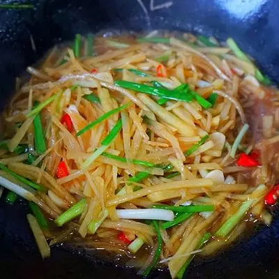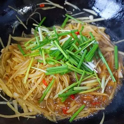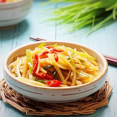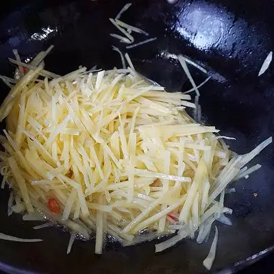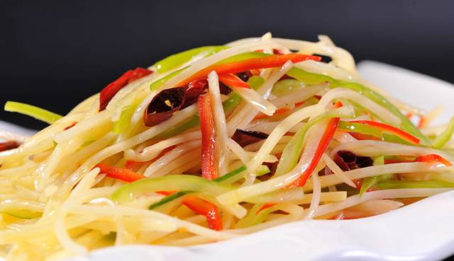 2.醋也有使土豆丝爽脆的作用。味道突出酸和辣,也就是辣椒和醋的作用,这个酸和辣可以根据自己口味来自由调节,喜欢辣的多放一些辣椒,喜欢酸的可以多加一点醋。