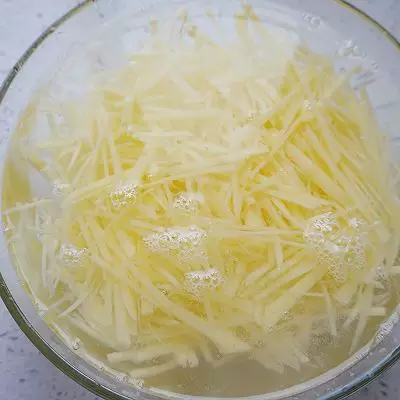 1.这道菜吃的是一个爽脆口感,所以欧欧要提醒你土豆切好丝以后一定要用清水泡2分钟去除淀粉。淀粉少了土豆炒制时就不容易很快炒烂了。