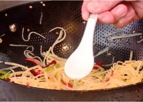 然后放一勺白醋,翻炒均匀。第二勺醋的主要作用是润锅,防止土豆丝烧糊粘锅,同时让土豆丝酸得更有内涵。▽