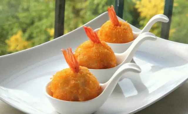 5.取適量土豆泥將蝦包裹好,留尾部在外面,在蛋液里裹一圈,再放進麵包糠里沾滿整個球,一個一個做好。
