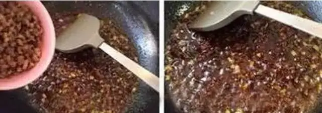 5.将炒好的肉沫加入酱中小火翻炒入味。