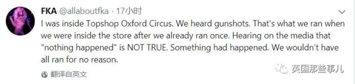 而在混乱之下, 大家开始各种道听途说的传播着“别人说前面发生了什么”... 700万粉丝的英国歌手Olly Murs当时在附近, 他连发3条推特表示 “艹,每个人赶紧撤离selfdriges! 有枪声! 我就在里面” “真的不知道发生了什么,我现在正在后面办公室里! 人们都在大叫,冲向出口!” “立刻撤离商场! 艹我心跳死了!! ”