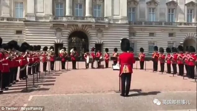 白金汉宫前女王的警卫乐队开始演奏《三狮 (Football's Coming Home)》
