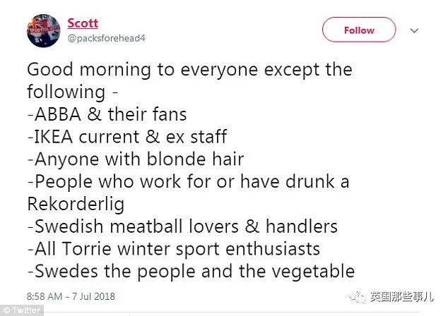早上好啊大家,除了以下人员: Abba和他们的粉丝。 宜家现在和之前的员工。 所有金发的人。 所有为rekorderlig工作过,或喝过它的人。(一家瑞典的酒厂) 所有瑞典肉丸的喜爱者和制作者。 所有torrie冬季体育爱好者。 所有瑞典人和瑞典蔬菜。
