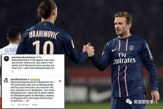 连小贝和伊布都在inst上为自己的国家开始隔空打赌。 伊布表示:yo,小贝,如果英格兰赢了,你想去哪吃,我就请你去哪吃,如果瑞典赢了,我想要在宜家买啥,你就要给我买啥。 小贝:如果瑞典赢了,我亲自带你去宜家买你洛杉矶新别墅需要的任何东西,如果英格兰赢了,你要穿着英格兰球衣,来温布利球场看一场英格兰的比赛,还要在中场休息时吃炸鱼薯条。
