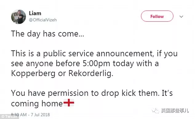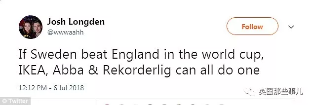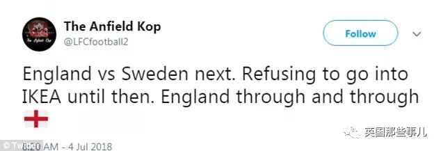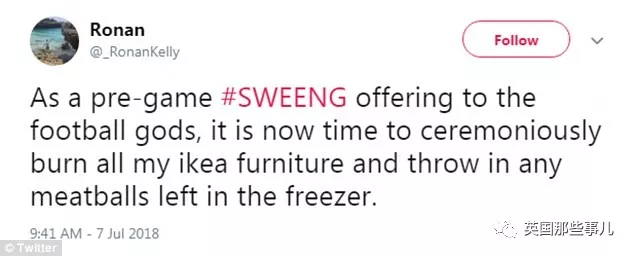 为了这场比赛,英国人可以说是非常激动了… “比赛之前,作为对足球之神的献祭,我将烧毁我所有的宜家家居,并且把冰箱里的所有肉丸都扔进去(肉丸是瑞典的传统美食)”