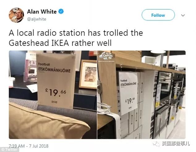 有家当地电台的工作人员还潜入Gateshead的宜家… 把商品名称换成:Football Etskömmånhjöme 把价格改成了£19.66.. 这是上次英格兰赢得世界杯冠军的年份…