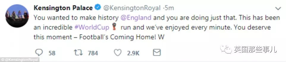 威廉王子特地通过推特发表祝贺。 “你们想要创造历史,你们做到了,超棒的一场比赛,我们享受其中的每一分钟。你们值得拥有这一刻的荣誉。 Football's Coming Home”