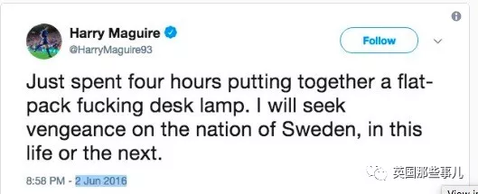 甚至人们还挖出了英格兰功臣马奎尔16年发的一条推, “刚特么花了4小时才把这破台灯组装好,我要找瑞典复仇,这辈子报不了就下辈子。”
