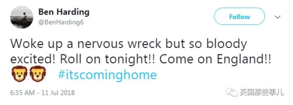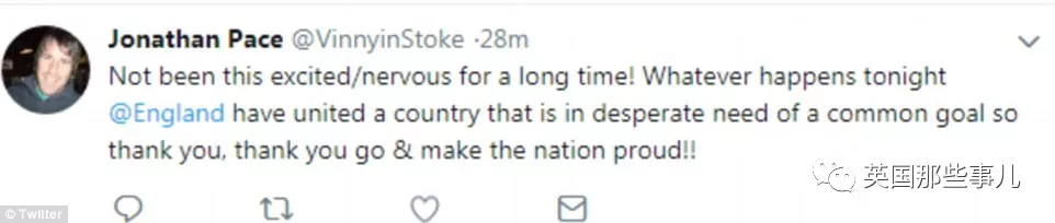 “好久没有像现在这样激动紧张过!!不管今晚发生了什么,英格兰队都将整个国家团结到了一起。 而我们(英国)现在真的非常非常需要这样一个共同的目标了! 谢谢你!谢谢英格兰队!让整个国家都燃了!”