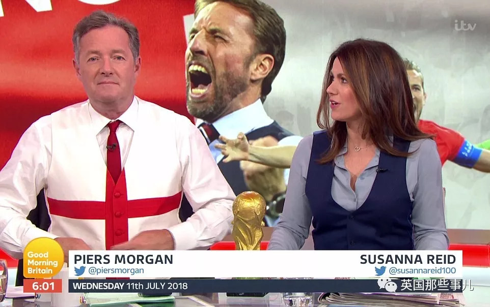 电视节目主持人,也穿着英格兰队配色的马甲上节目: