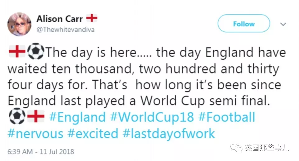 自从上周六英国队2-0战胜瑞典挺进世界杯4强后, 整个英国粉丝就处于狂喜乱舞的激动之中。 马上就要半决赛了,整个英国的画风,都因为三喵球迷们变得更是嗨了: “今天终于到了!这个英格兰等了10234天的日子! 10234天就是我们距离上次挺进半决赛的时长啊!!”
