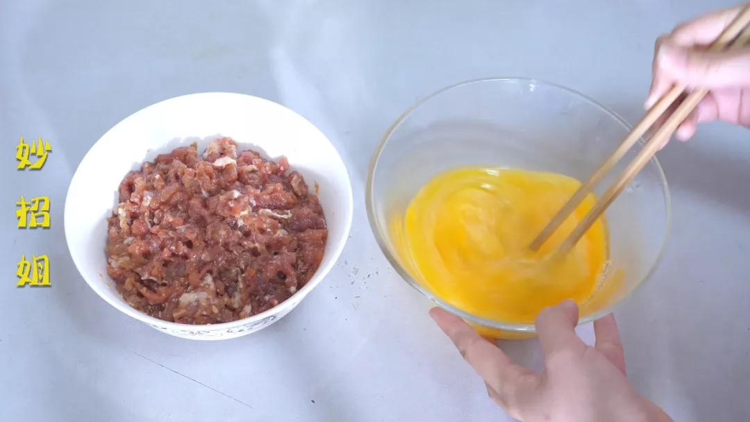 首先大家根据自己的口味调好肉馅,然后我们打入几个鸡蛋在碗中,再将鸡蛋打散