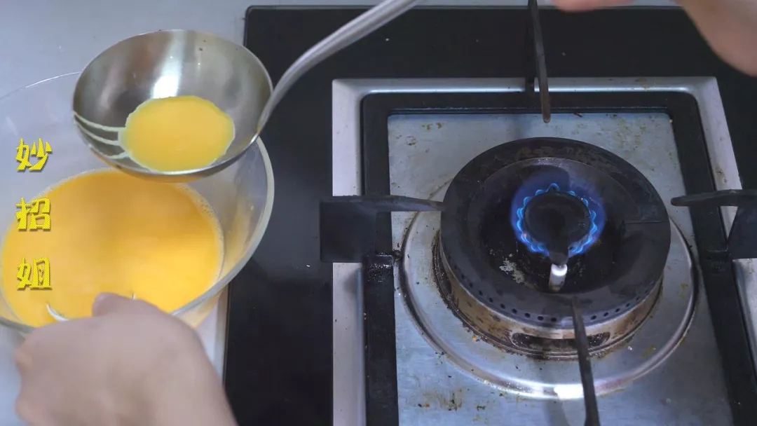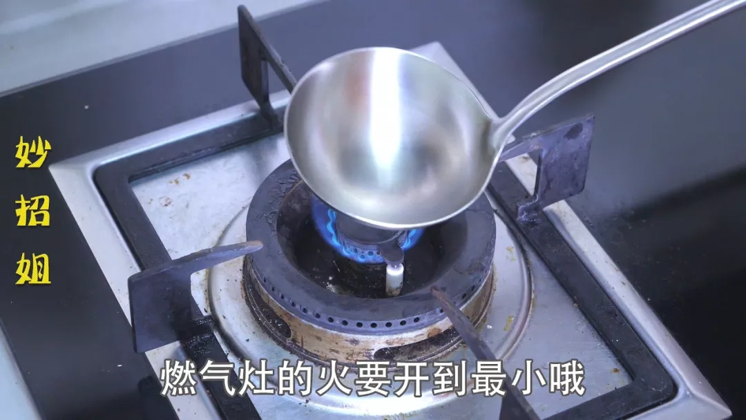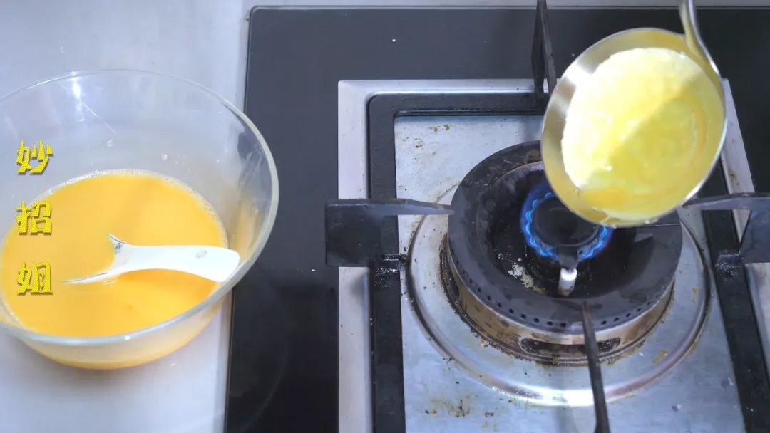 蛋液搅拌均匀后,我们再准备一个大一点的汤勺,然后把勺子放在燃气灶上稍微加热一下,燃气灶的火要开刀最小哦