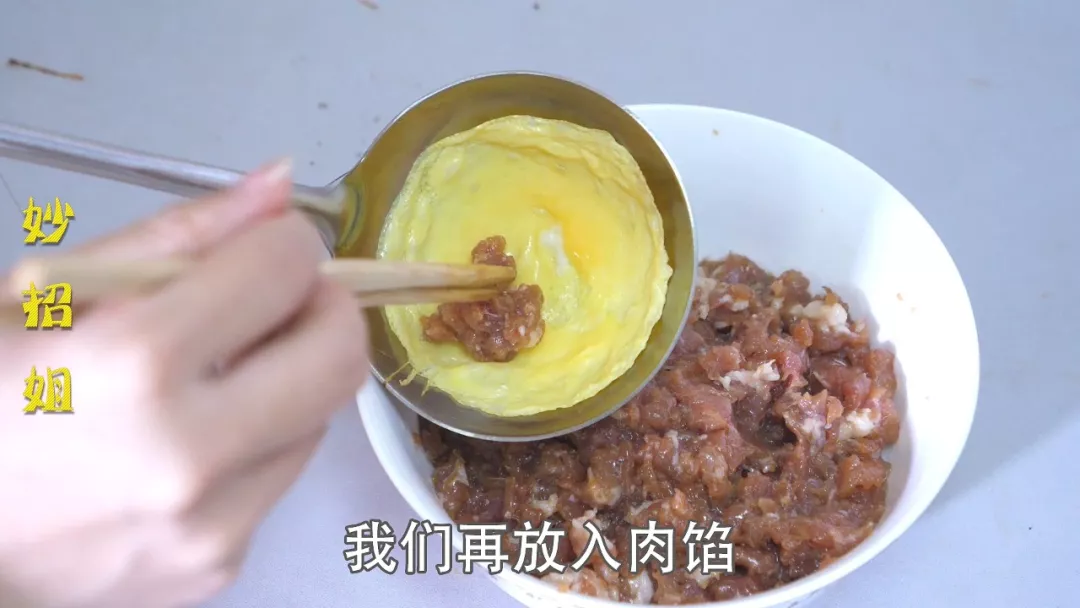 蛋皮成形后,我们再放入肉馅,然后用筷子把蛋皮这样翻过来包好,边缘压一压