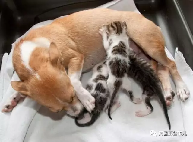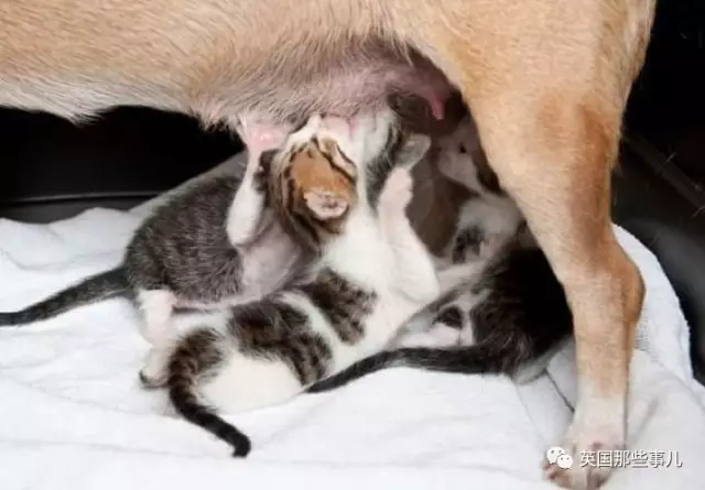狗狗当起了猫咪们的妈妈,正在给它们喂奶... 也许是想到自己刚刚出生的孩子们,狗狗喂的格外细心,还会时不时伸出舌头舔舔它们。 一夜之间,它仿佛就成了喵咪们的妈妈,