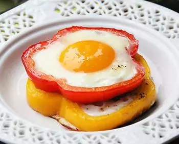 2.取鸡蛋分别打入彩椒圈中,中小火单面煎制,撒适量盐、黑胡椒调味即可。