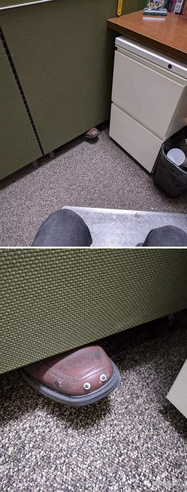 我的同事总是把脚伸到我的工位, 所以我给他的脚贴了一对“电子眼”…