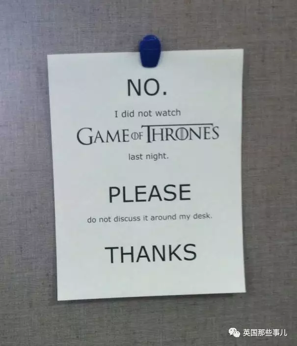 我老公给我发来了这个,告诉我现在整个办公室危机四伏… “不!! 我昨晚没有看权力的游戏。 求求你们!! 请不要在我的办公区域剧透。 谢谢!!”