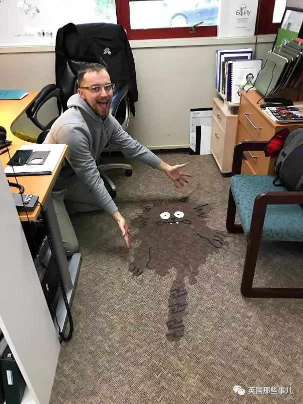我的同事在办公室不小心把酒弄洒了, 机智的我把一大滩水渍改造成了一只搞笑的喵星人,