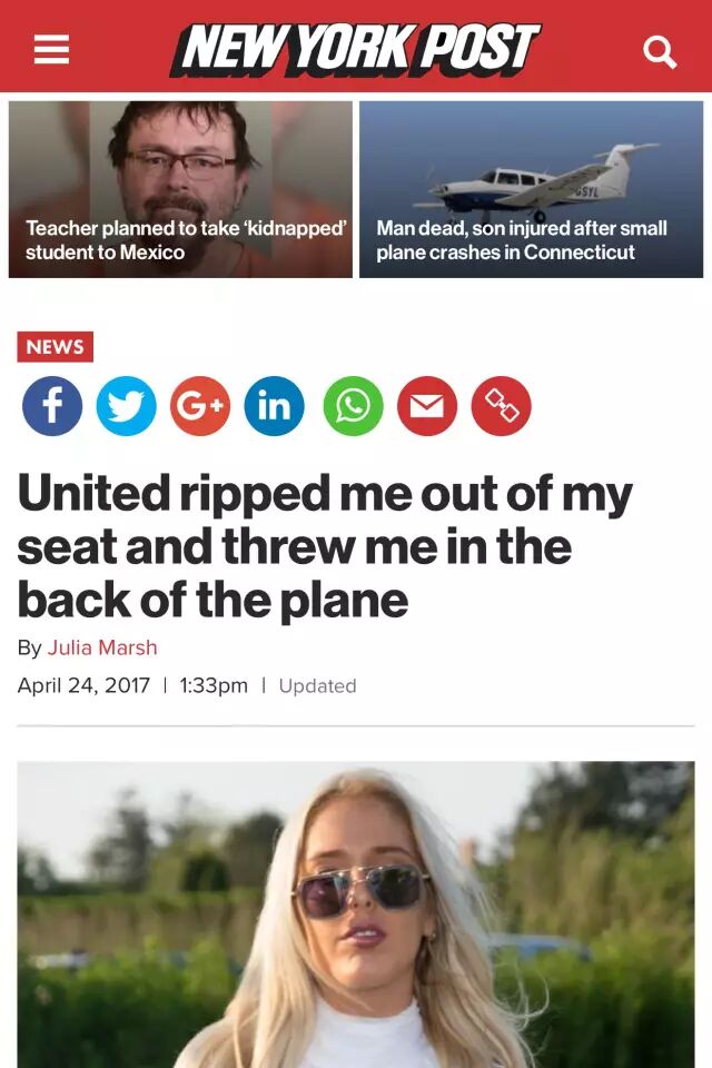 然而就在起飞前十分钟,美联航的一位乘务员,在完全没有说明理由的情况下,让她把座位让出来,改坐到后面经济舱21B座位。