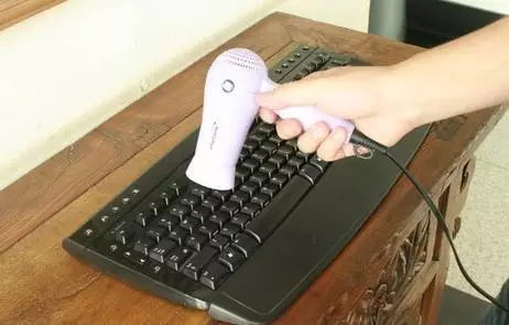 在电脑关机状态下,用电吹风吹键盘,藏在间隙中和按键下的灰尘、毛发和细屑就会被吹出来。