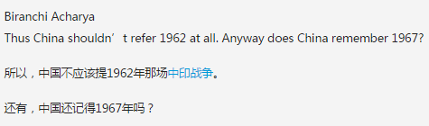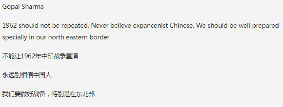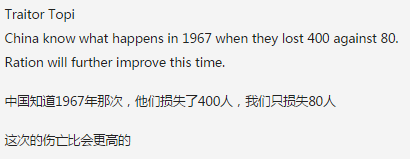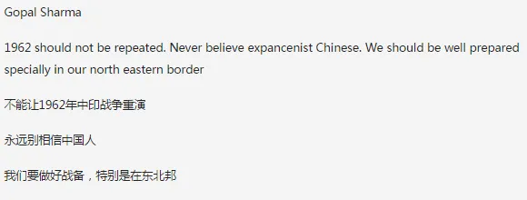 在1962年的中印战争中,一水美械,信心暴崩的印军被土共平推麦克马洪线,几乎打出了1:5的战损。为了掩盖这种近乎于耻辱的失败,印度的舆论和精英一股脑地将责任推到了中国的头上,将中国塑造成了背信弃义者的形象,与此同时还不遗余力的宣扬中国撤军是因为畏惧于阿萨姆平原的印度大军,再加上印度对1976年中印边界冲突的诡异渲染(这场冲突中方的记录是阵亡32人击毙印军101人,印度则宣称阵亡88人、负伤163人,击毙中国军队340人、伤450人,连击伤几个都一清二楚!)这直接造就了一批对印度实力有着盲目自信的印度人民。比如这些。