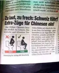 中国人又一次扬名海外。据瑞士一家报纸报道,瑞士将专门为中国人开通前往景区的火车,原因是中国人“太吵、太不讲规矩”(Zu laut, zu frech: Schweiz führt Extra-Züge für Chinesen ein)。 到底有多不规矩呢?中国人在火车上除了大声喧哗,还随意往地上吐痰、厕所一片狼藉。为此,该报还配了两幅图:第一幅图脚踩在马桶上大便(这是错的),第二幅图是坐在马桶上(这是对的)。仿佛中国人来自外星,根本不知道地球上的如厕规矩。