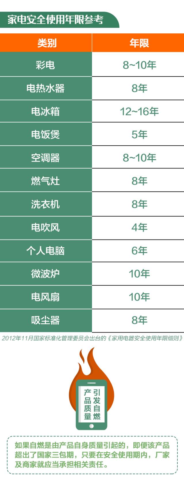 图中内容整理自 齐鲁晚报 、中国篮球 家电也有“生命周期” 在家用电器消费方面,多数消费者抱着“新三年、旧三年、修修补补又三年”的传统观念。殊不知,家电也有使用年限。 以空调为例,空调壁挂机的使用寿命一般在8~10年,超过年限,空调可能不会彻底罢工,但由于各部分机件的老化、磨损,工作效率、经济性和安全性都会大打折扣。 注意,对于“高龄”空调要及时更换,尽量不要购买、使用二手空调和杂牌空调,以免造成人身财产损失。