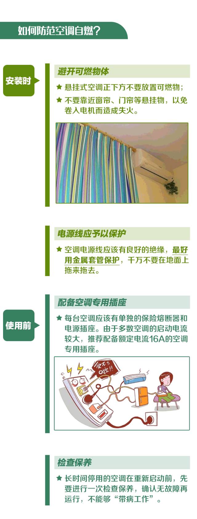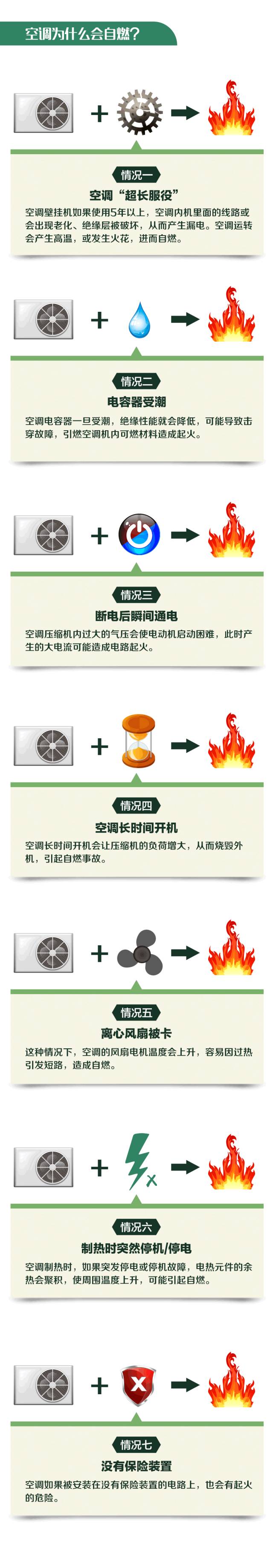 △2017年5月 北京丰台一户家庭空调出现起火自燃。 空调是夏天使用率最高的电器,很多人习惯整夜开着空调休息。空调安全不容有一丝的隐患。那空调为何会自燃?我们该如何正确使用空调?这当中暗藏的危险,我们又该如何应对? 看图掌握↓↓↓空调安全不容忽视。