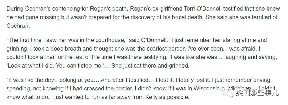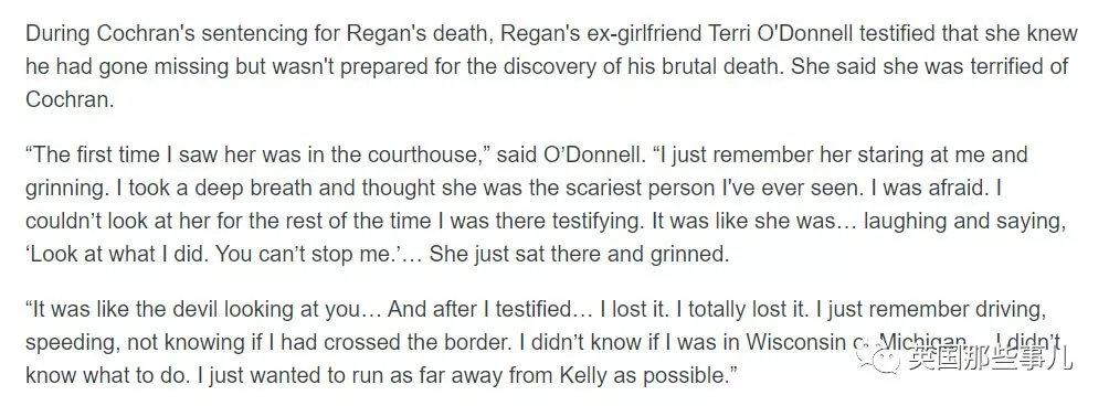 在审判期间,Chris的前女友也出席了, 她在事后的采访中形容Kelly是她见过最可怕的女人之一。 “我第一次见到她(kelly)是在法院的时候,只记得她一直盯着我,露齿而笑。她真的是我见过最可怕的人。我坐在法庭中甚至没有办法直视她.... 她坐在那就像魔鬼一样看着你......在我出席作证之后......我只记得我疯狂的加速开车逃离那里,因为我只想尽可能远离她。”