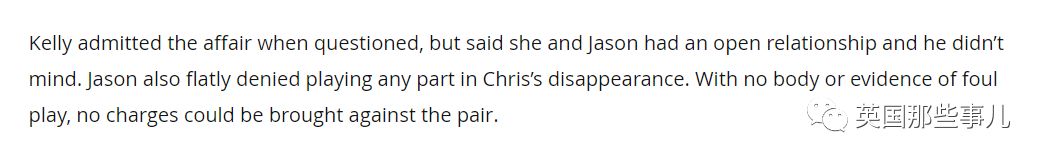 在警方询问这对夫妇的时候,两人均否认了自己和Chris的消失有关, Kelly声称自己和Chris的这段感情,作为老公的Jason并不介意; 而Jason也将责任推得一干二净:“Chris消失了吗?我真的不知道哎!我为什么要去在意一个绿过我的男人之后的生活???”
