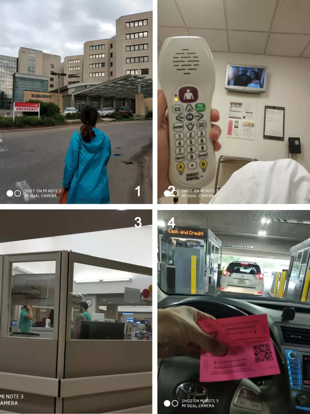 1)急诊入口和陪我看病的小姐姐;2)急诊诊室内全自动病床和电视;3)大胡子医生在给我打印注意事项;4)2张免费停车券