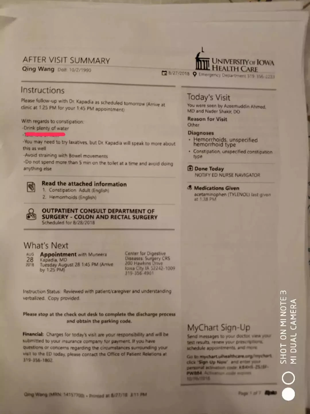 我所在的爱荷华大学医学院是全美排名前20的医学院,其附属医院也是实力强大,在国内的话相当于江苏省人民医院的水平。周一早上,我按照苑老师的指示,拨通了family medicine(类似于国内的家庭医生)的预约电话,我告诉她我得了痔疮,疼痛难忍,需要预约一个urgent care(要求立即看医生)。